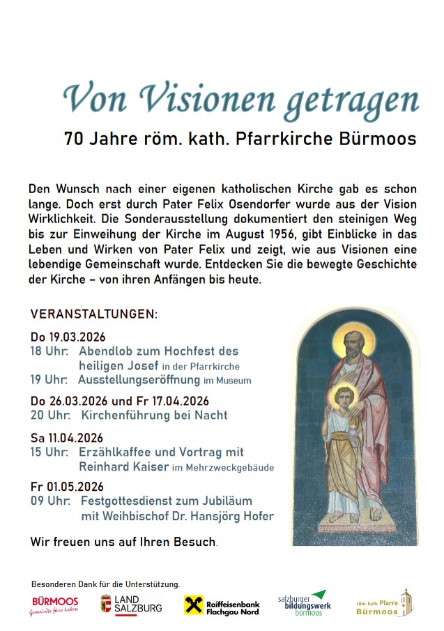 Die Pfarrkirche in Bürmoos wurde am 12. August 1956 geweiht. Das Altarbild, das Josef und den jungen Jesus darstellt, stammt von dem russischen Künstler Nikolaus von Meyendorff.